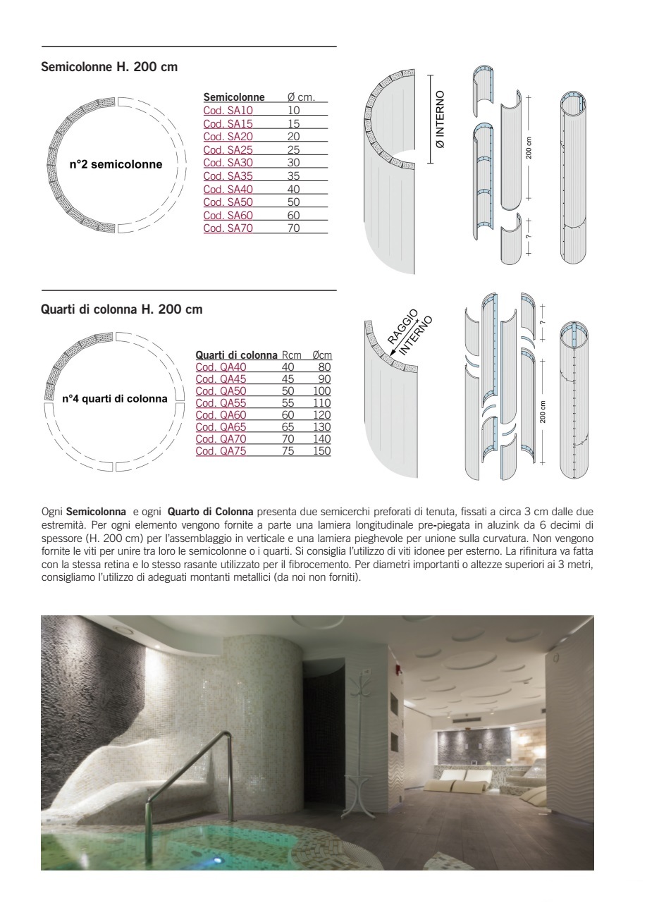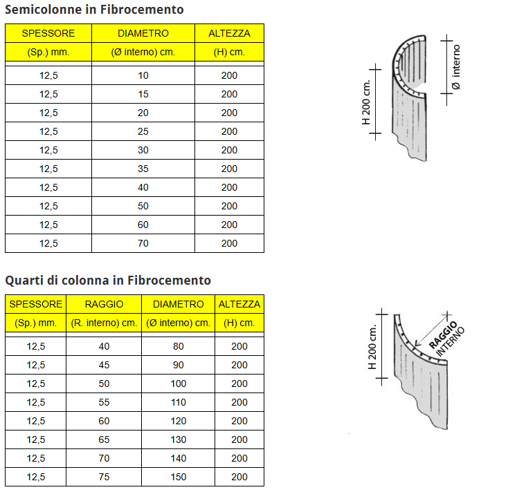 Semicolonne e quarti di colonna in fibrocemento con spessore di 12,5 mm, progettati specificamente per un utilizzo esterno. Gli elementi presentano un diametro interno che varia da 10 cm a 70 cm, nella quale configurazione si impiegano n. 2 semicolonne, mentre per diametri che spaziano da 80 cm a 150 cm si utilizzano n. 4 quarti di colonna, mantenendo un’altezza standard di 200 cm.